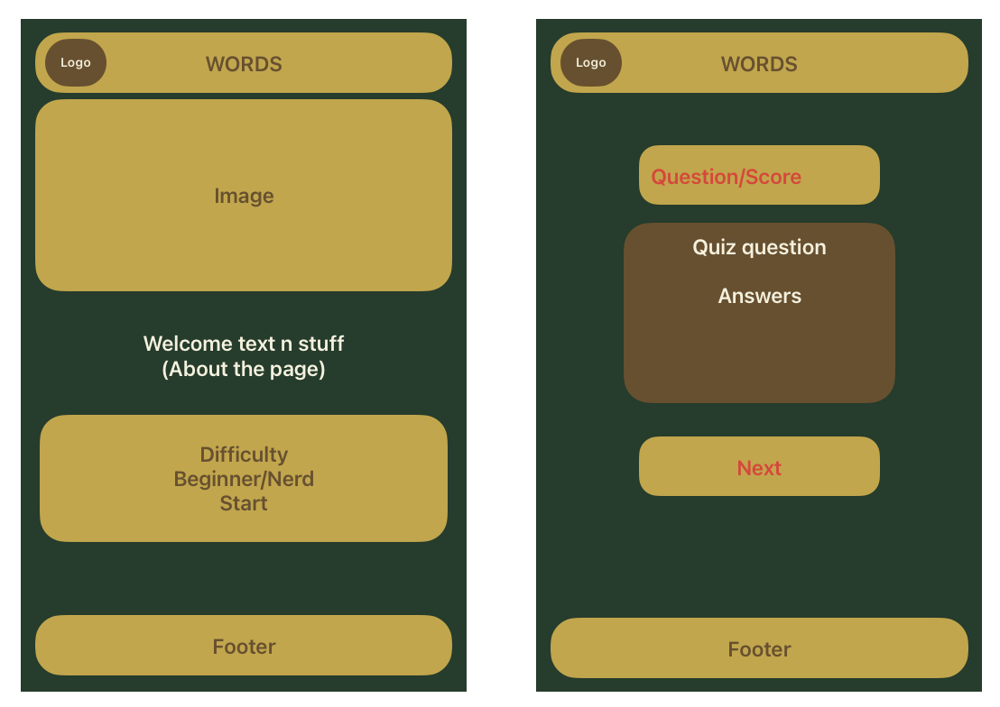 The quiz page contains the header at the top followed by the current question and several answer buttons. Below the answers is a next button and a display showing the current score. The footer appears at the bottom of the page.